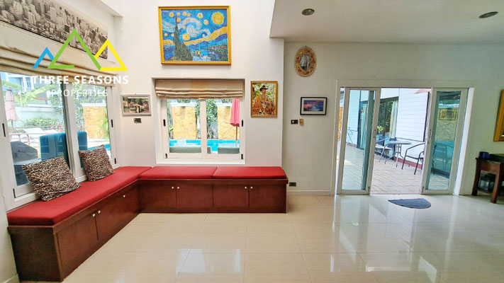 Vaste Salon : Avec une magnifique fenêtre massive donnant sur la piscine