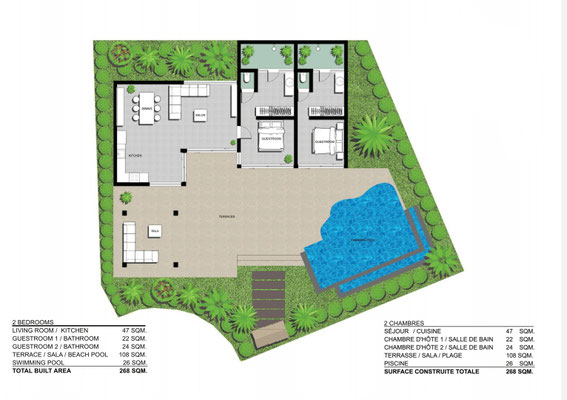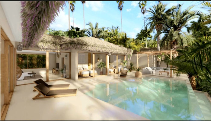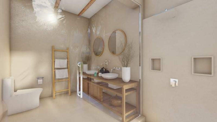 Phase2: 3 villas with 4 bedrooms. Each has its own privacy, with private access and parking space. We only use quality materials and equipment (Daikin air conditioning, teak for wooden surfaces), and the waxed concrete finish gives a lot of character.