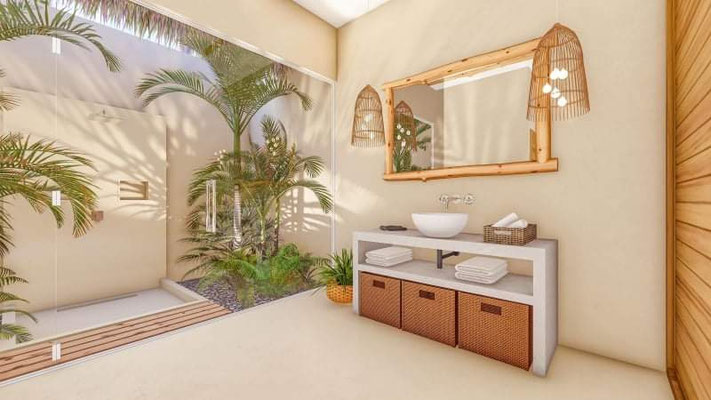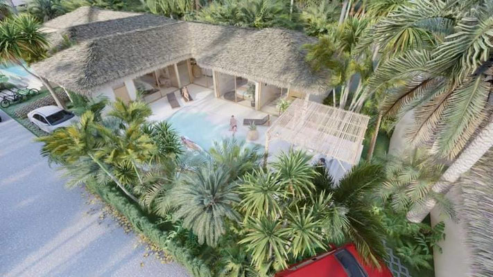 Phase2: 3 villas 4 chambres. Chacune dispose de son intimité, avec un accès et un espace de parking privés. Nous utilisons uniquement des matériaux et des équipements de qualité (Climatisation Daikin, teak pour les surfaces en bois), et la finition en béton ciré donne beaucoup de cachet.