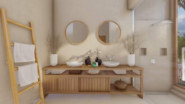 The bedrooms are spacious and have large sliding teak windows, allowing natural light to enter the room, giving views of the sky, nature and direct access to the swimming pool. The bedrooms are equipped with all the necessary elements for your comfort such as dressing room and dressing table. A king-size bed will ensure a peaceful night's sleep.