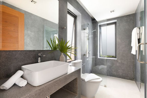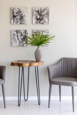 Au cœur de la piscine, une piscine à débordement de 10 mx 4 m avec un carrelage Cotto de qualité supérieure invite à une baignade rafraîchissante tout en profitant d'une vue panoramique jusqu'à Koh Phangan. La piscine est entourée sur trois côtés par une grande terrasse revêtue de travertin mesurant env. 120 m². 4 chaises longues en aluminium et une table d'extérieur avec 2 bancs et chaises complètent l'aménagement extérieur au niveau principal de la villa. L'eau et l'électricité sont disponibles pour installer une grande cuisine BBQ entre les deux jardinières du côté gauche de la terrasse.