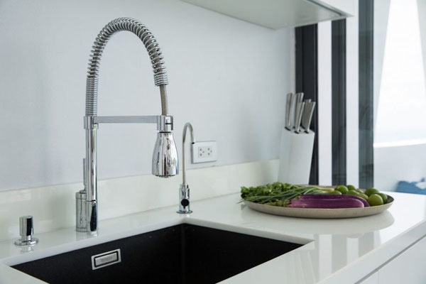 Plantation tropicale en pot, fontaine à l'entrée- Système de filtre à eau potable par osmose inverse- Ventilateurs de plafond