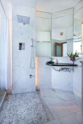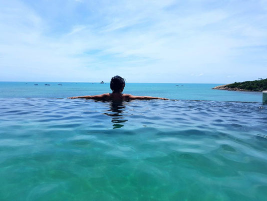 The outdoor area offers a private 4x9m infinity pool with panoramic ocean views with sun loungers.