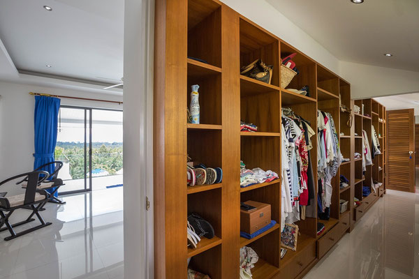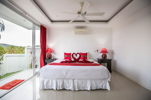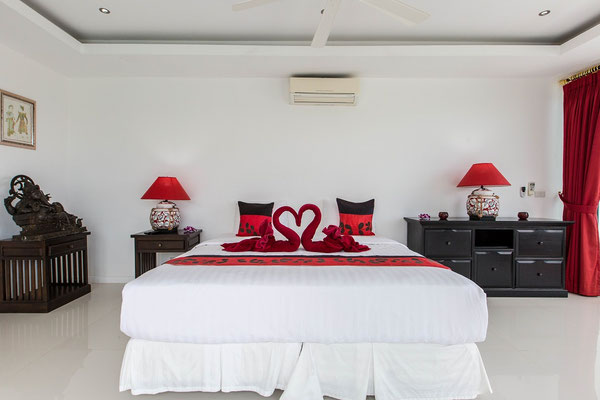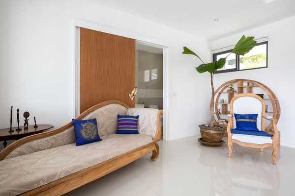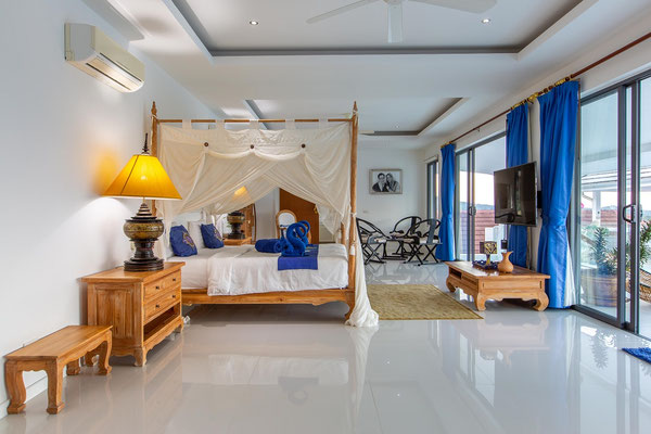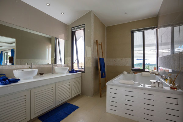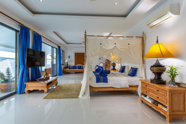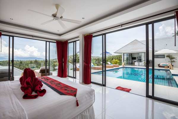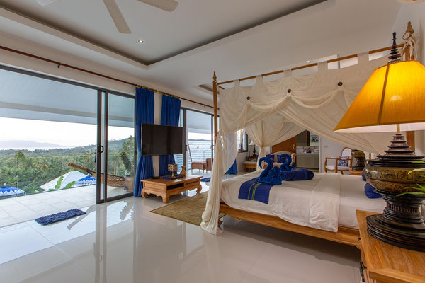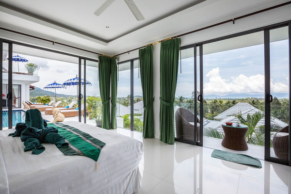 5 chambres avec salles de bains dont une suite principale de 150 m2 avec 2 salles de bains et un grand dressing et vue impressionnante sur la baie de Mae Nam.