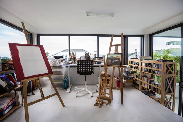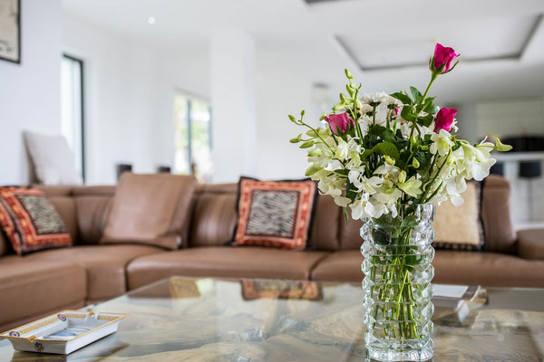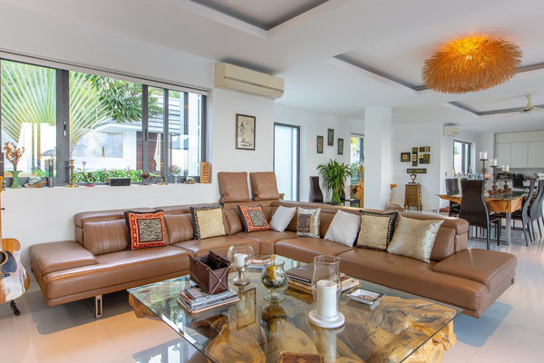 Salon très spacieux (150 m²) décoré avec goût donnant sur la cuisine ouverte entièrement équipée.
