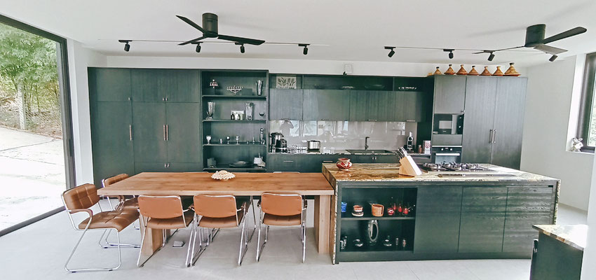 Cuisine: Western moderne contemporain (lave-vaisselle, four, micro-onde, réfrigérateur, table d’île, bar)